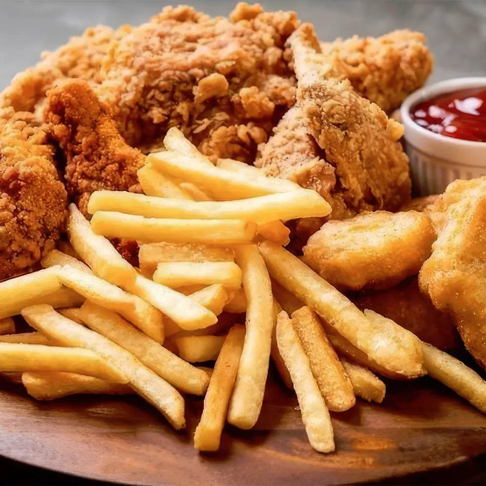 1/2 pollo broaster, porción francesa, yuca y patacón.